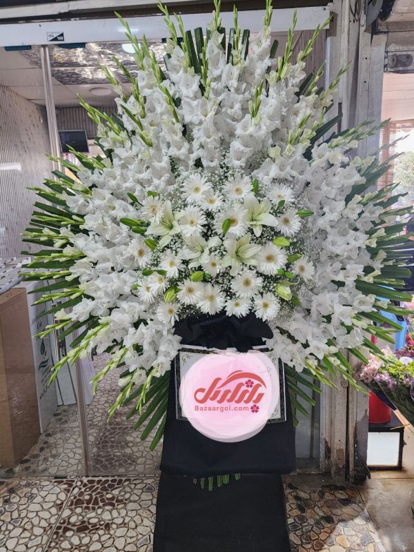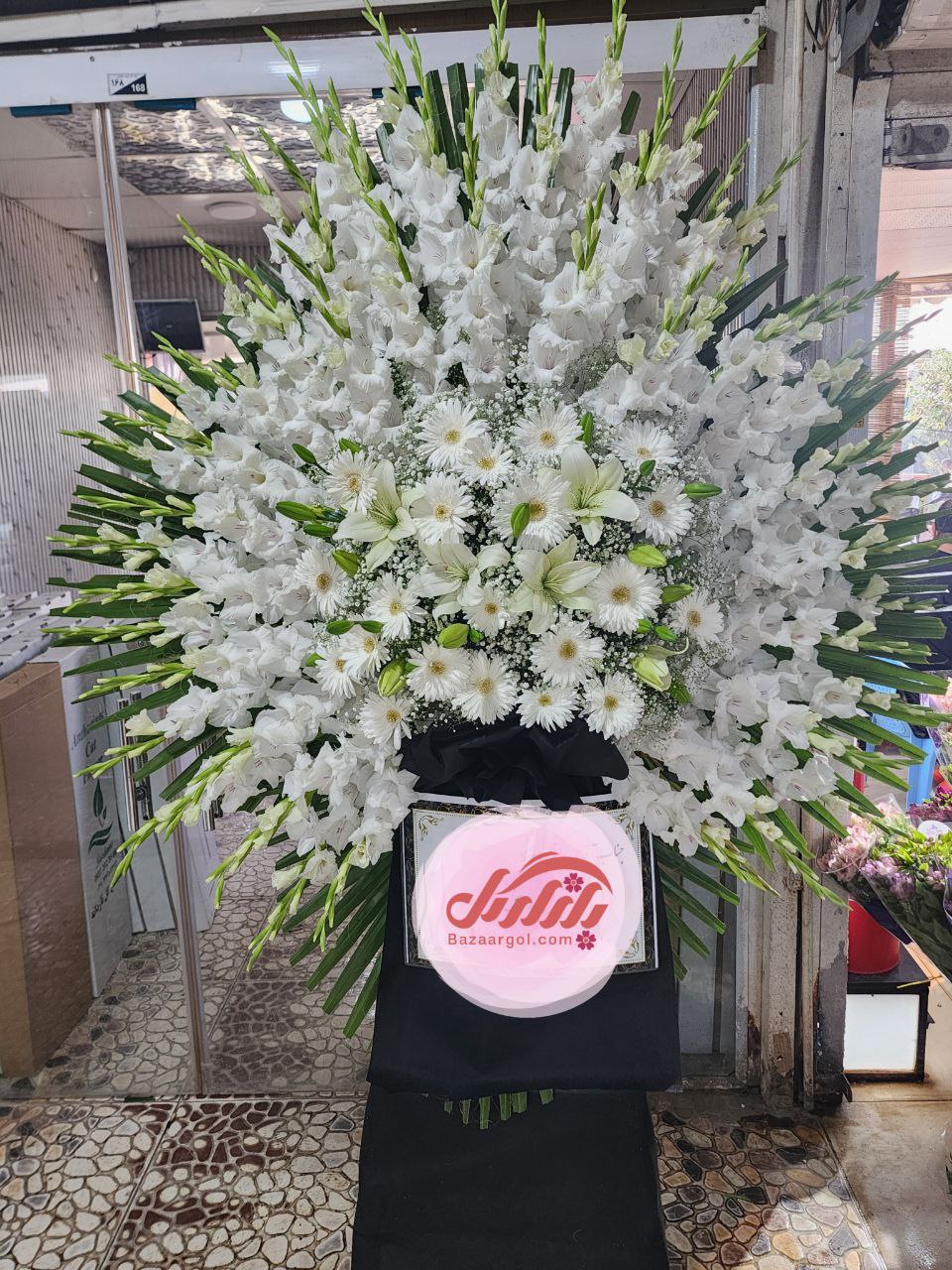 50شاخه گلایل، 20شاخه ژربیرا،اورینتال،ژیپسوفیلیا، تزیین در پایه چوبی یک طبقه